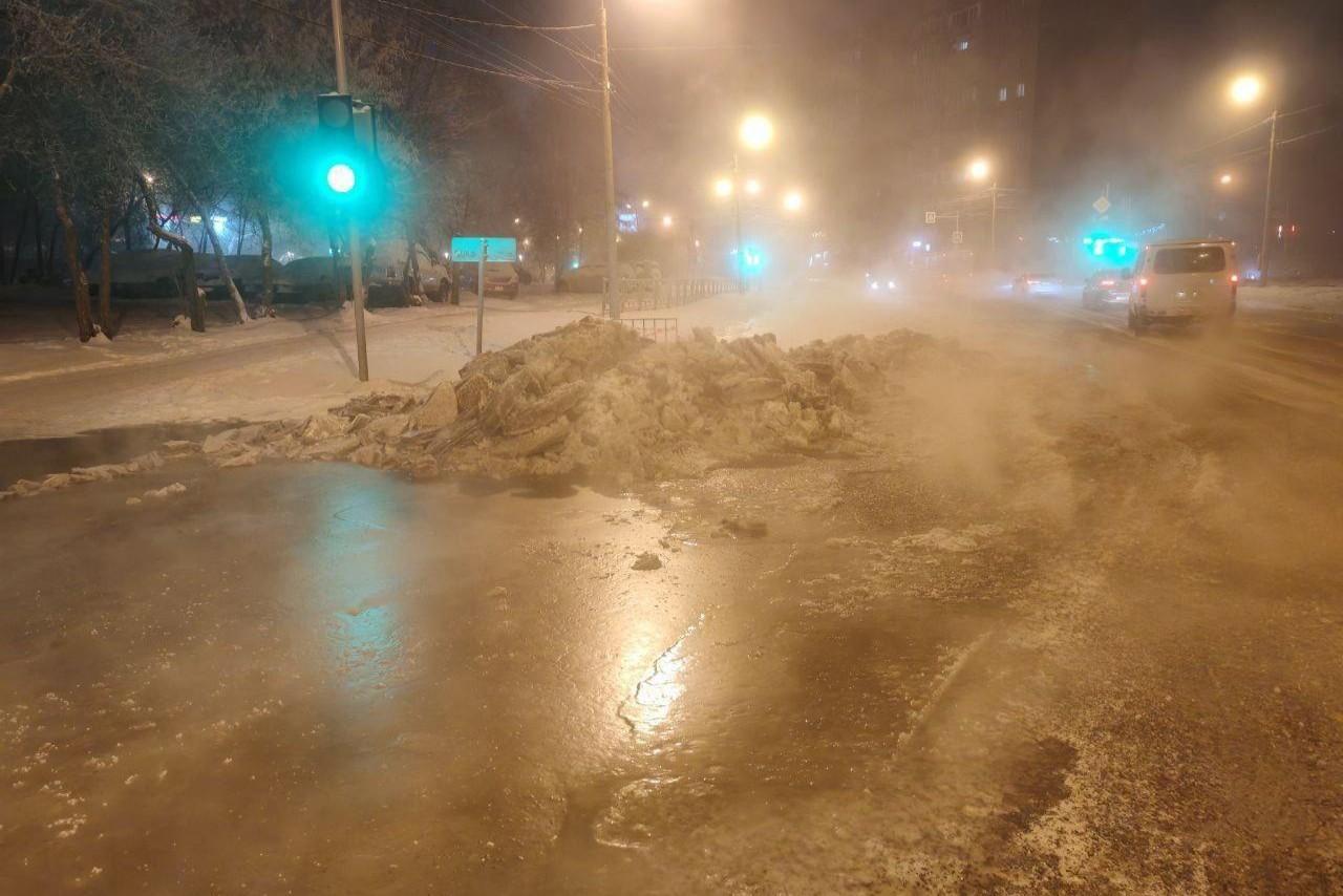 В Красноярске из-за коммунальной аварии образовался каток прямо на дороге — когда его уберутВода начала заливать проезжую часть накануне вечером